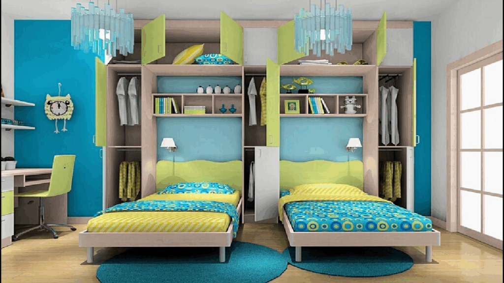 Consider a corner double bed with a twist for the kids’ room. Make the bed interesting by adding a headboard and sideboard that separate the sleeping area from the rest of the room. Boards divide the play area from the study area in this structure. They also keep the walls from getting stained.