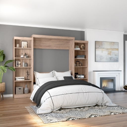 Most contemporary homeowners need additional hidden spaces. This concept suits those who want a simple concept or who have a small bedroom. Choose accessories like wooden tiles and side tables that complement the bed’s wooden finish to complete the look.
